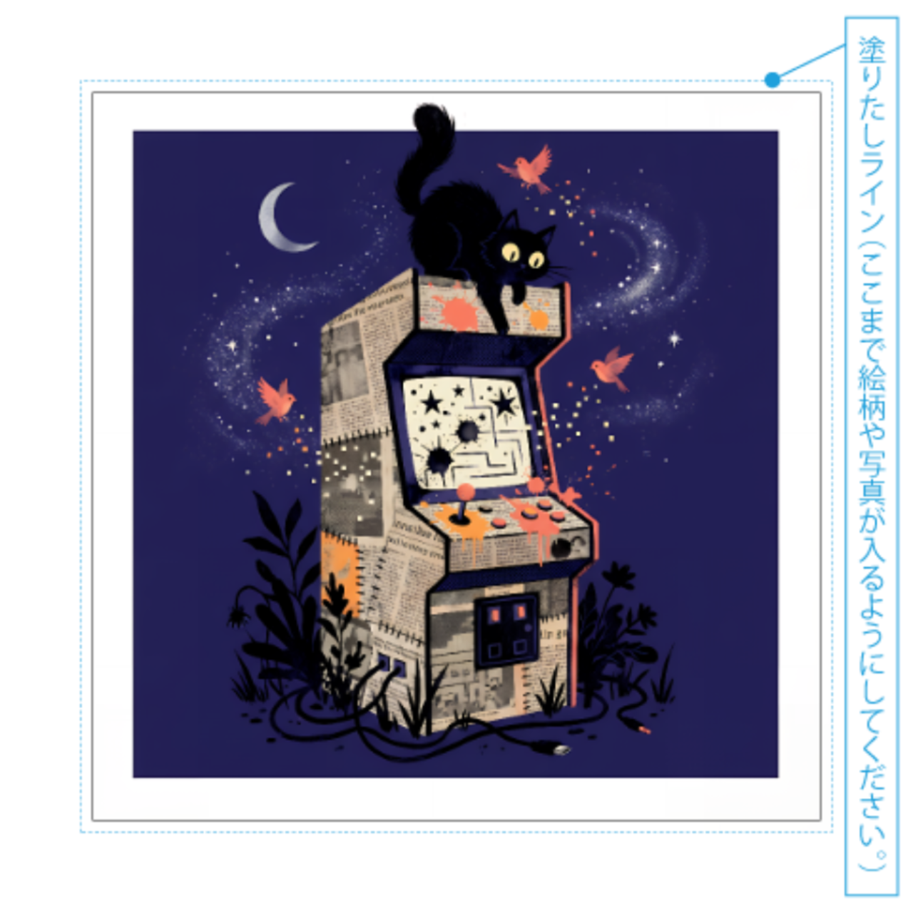 新聞紙のコラージュ調で表現されたゲーム筐体と、