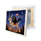 トナカイの背に乗った黒猫が星灯りの下を進む、
