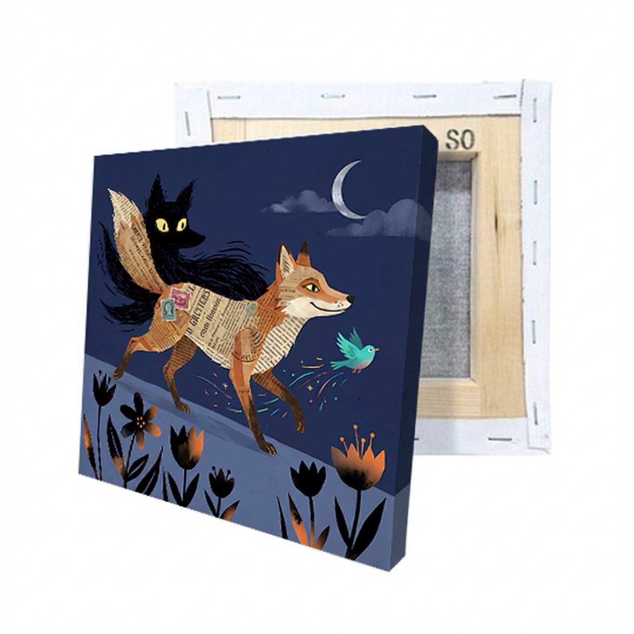 深い夜空の下、キツネの背に乗った黒猫と、