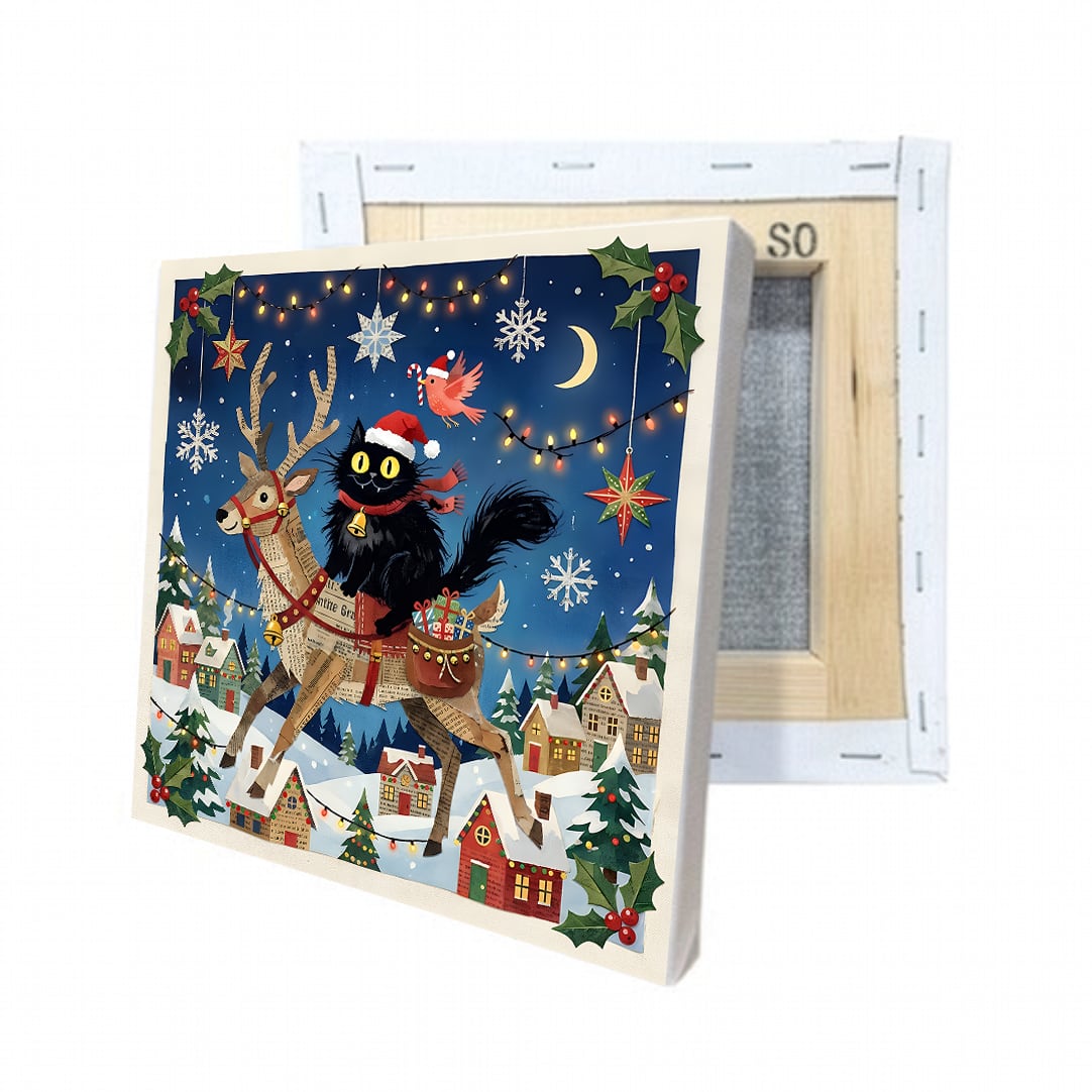 黒猫とトナカイを描いたキャンバスアートです。