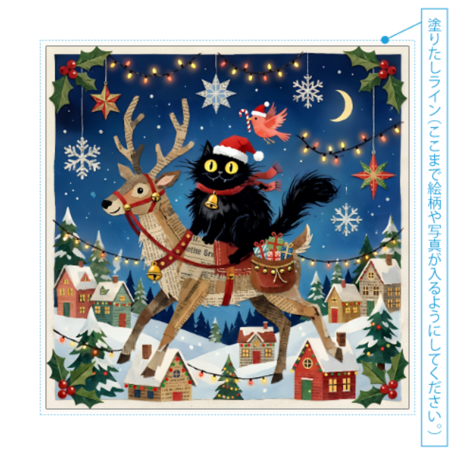 サンタ帽をかぶった黒猫がトナカイに乗り、