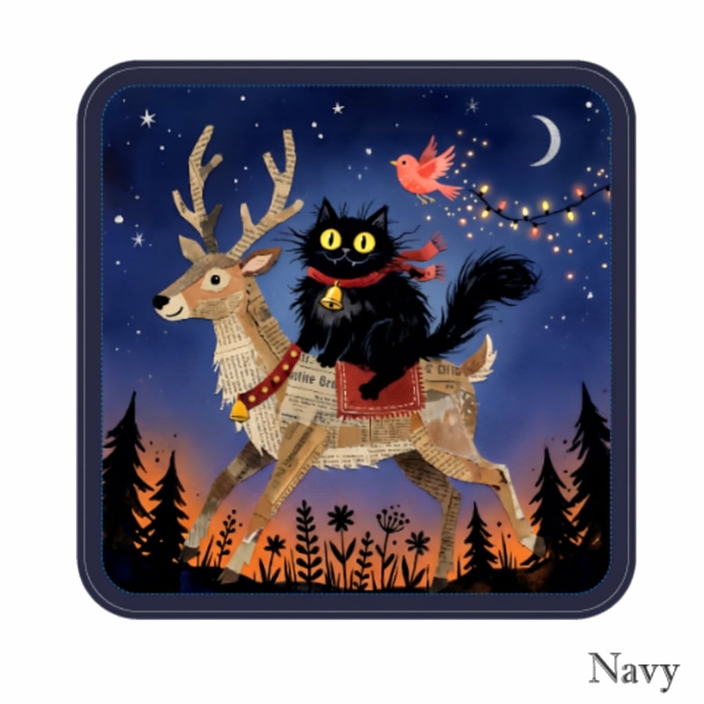 トナカイの背に乗った黒猫と、星や月、小さな鳥たちを描いた