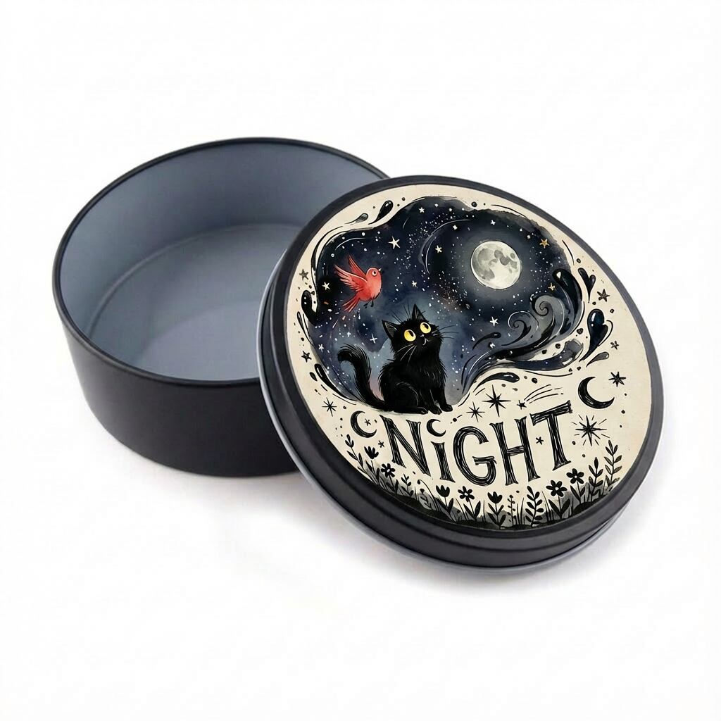 月明かりの夜空を背景に、黒猫と小鳥を描いたデザインの缶ケースです。