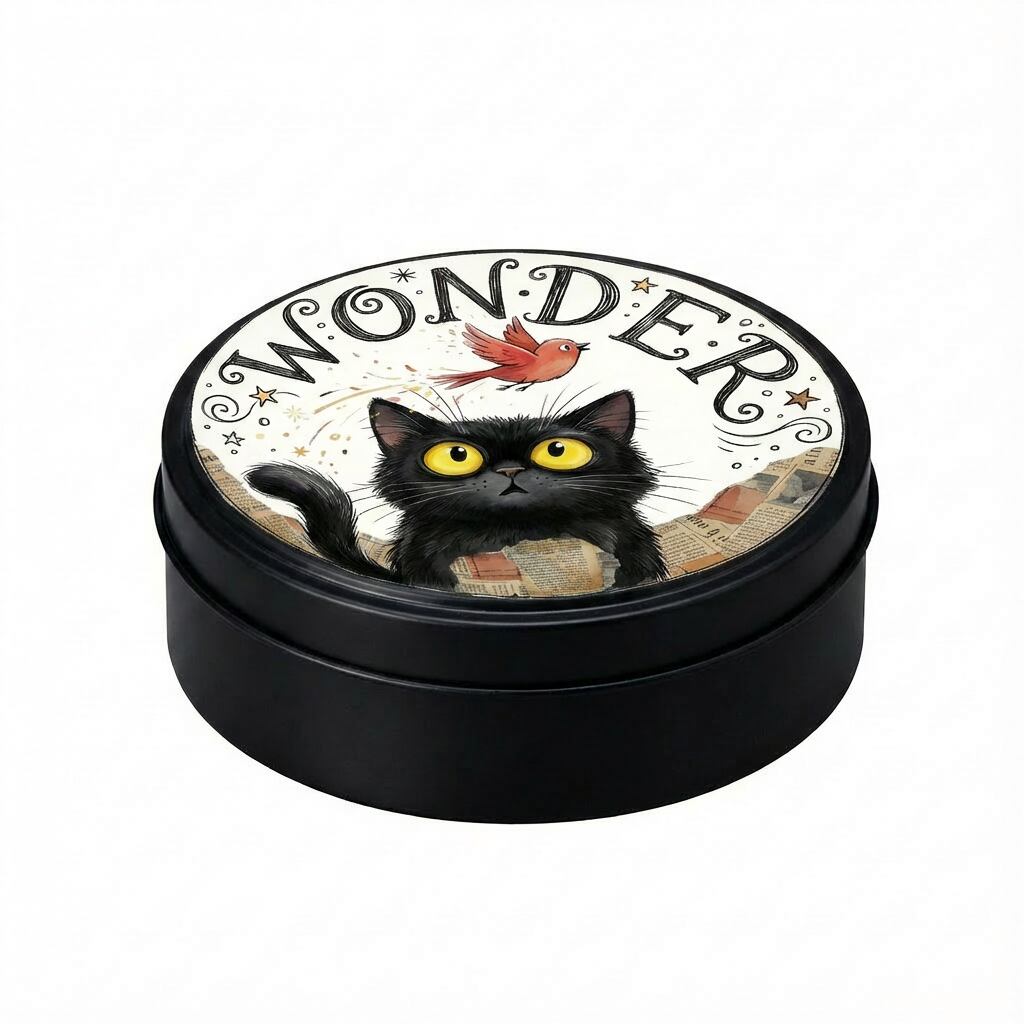 黒猫と小鳥をモチーフにした、物語性のあるイラストが印象的なデザイン缶です。